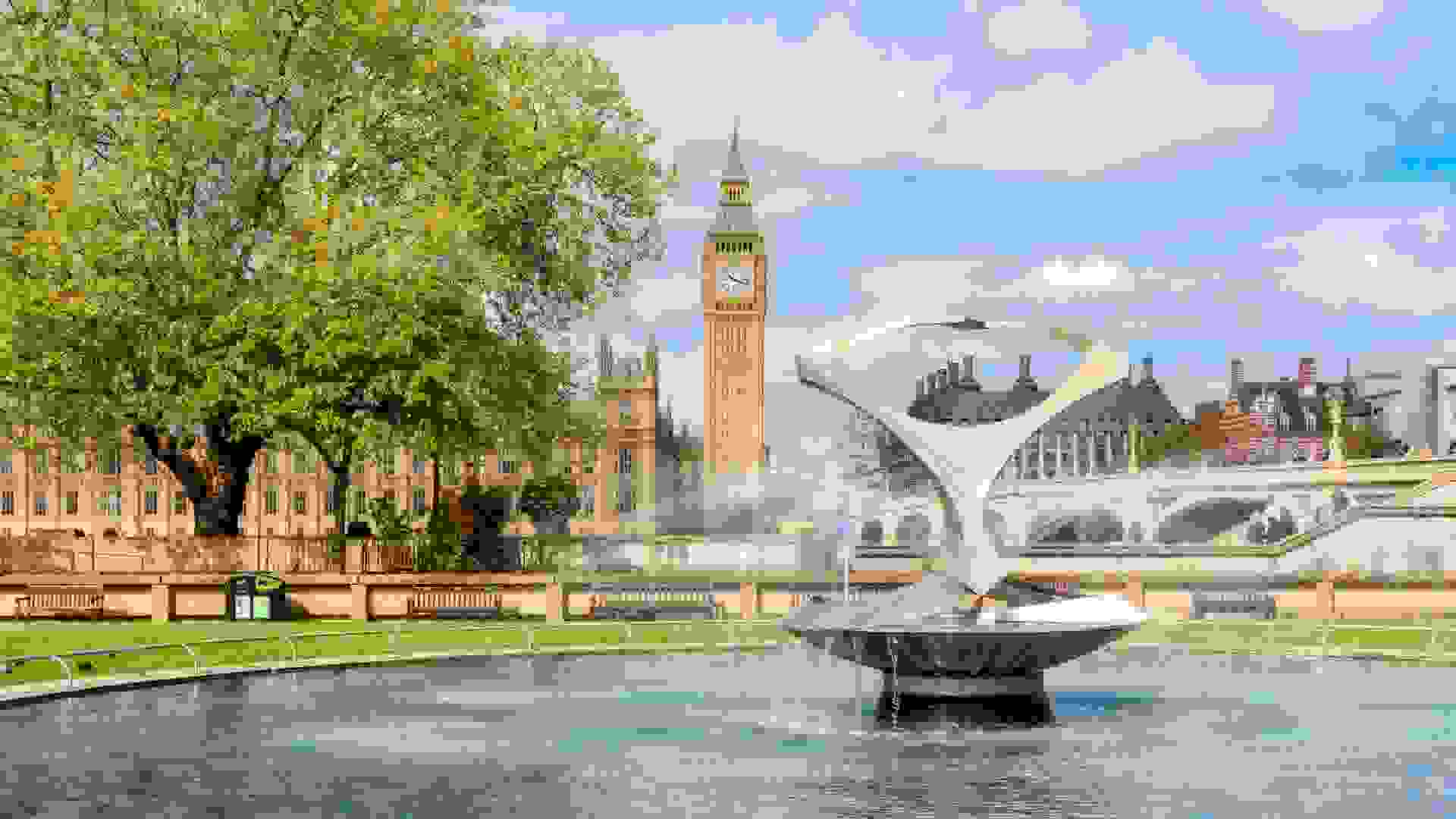 Fountain of St Thomas gardens and Big Ben. © Mistervlad - stock.adobe.com